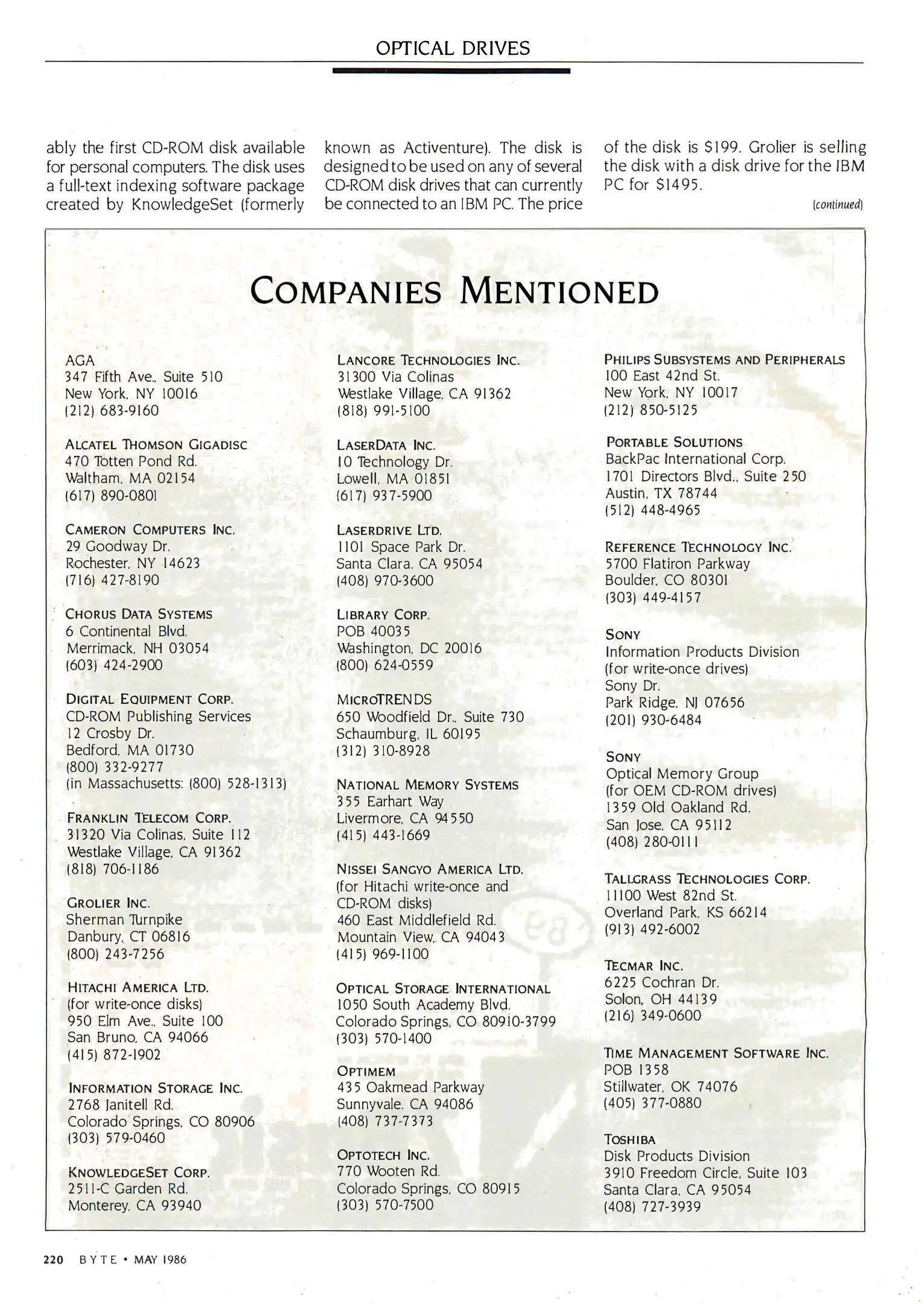 Byte Magazine - Mass Storage [[lang_hl=es,Español]Mayo de 1986[/lang_hl] [lang_hl=en,English]May of 1986[/lang_hl]]